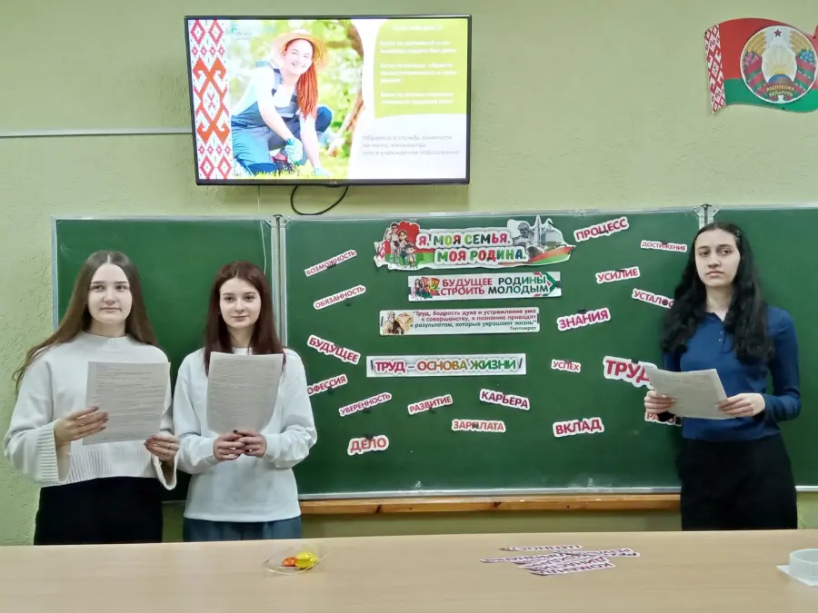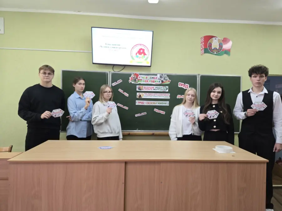 «Человек славен трудом» - так звучала тема занятия. Ребята рассуждали о важности трудовой деятельности человека на благо своей страны, рассуждали о том, кто такой «человек труда» и какую роль он занимает в современном обществе. Одиннадцатиклассники получили более полную информацию о трудовых инициативах БРСМ, о белорусском студотрядовском движении. Ребята обсудили возможность трудовой занятости в свободное время. Многие ребята на летних каникулах трудились в составе студенческого отряда БРСМ. Девушки работали на заводе БАТЭ, выполняли сборочные работы. Ермакова Аня, Юха Даша, Синяк Софья поделились впечатлениями о своей работе, рассказали, в чем преимущества трудоустройства по инициативе БРСМ.