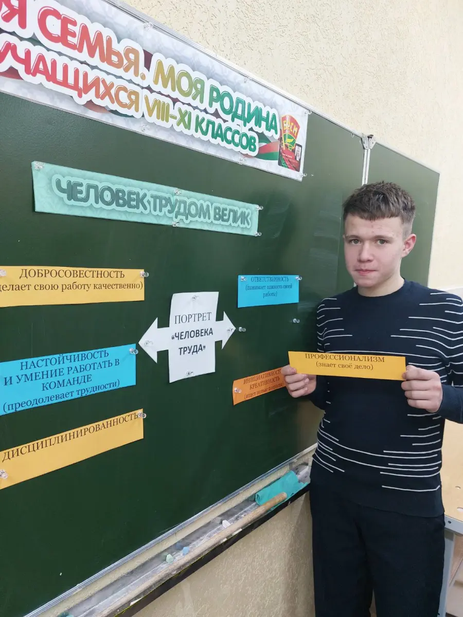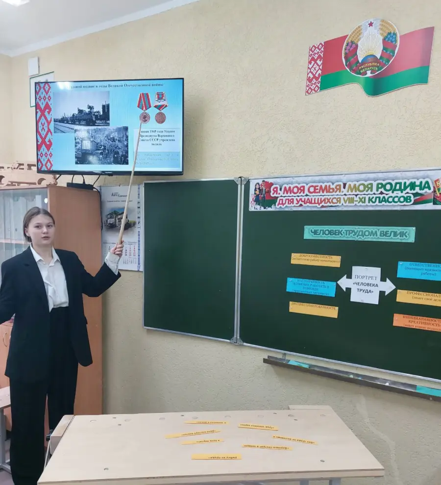 На занятии, учащиеся узнали, что понимают под определение -трудовой подвиг, в каких формах он проявляется. Так же ребята обсудили трудовые традиции Беларуси. Вспомнили в каких трудовых акциях принимали участие. В конце занятия учащиеся составили "Портрет "Человека труда". Определили какими качествами должен обладать человек, который трудится на благо своей страны.