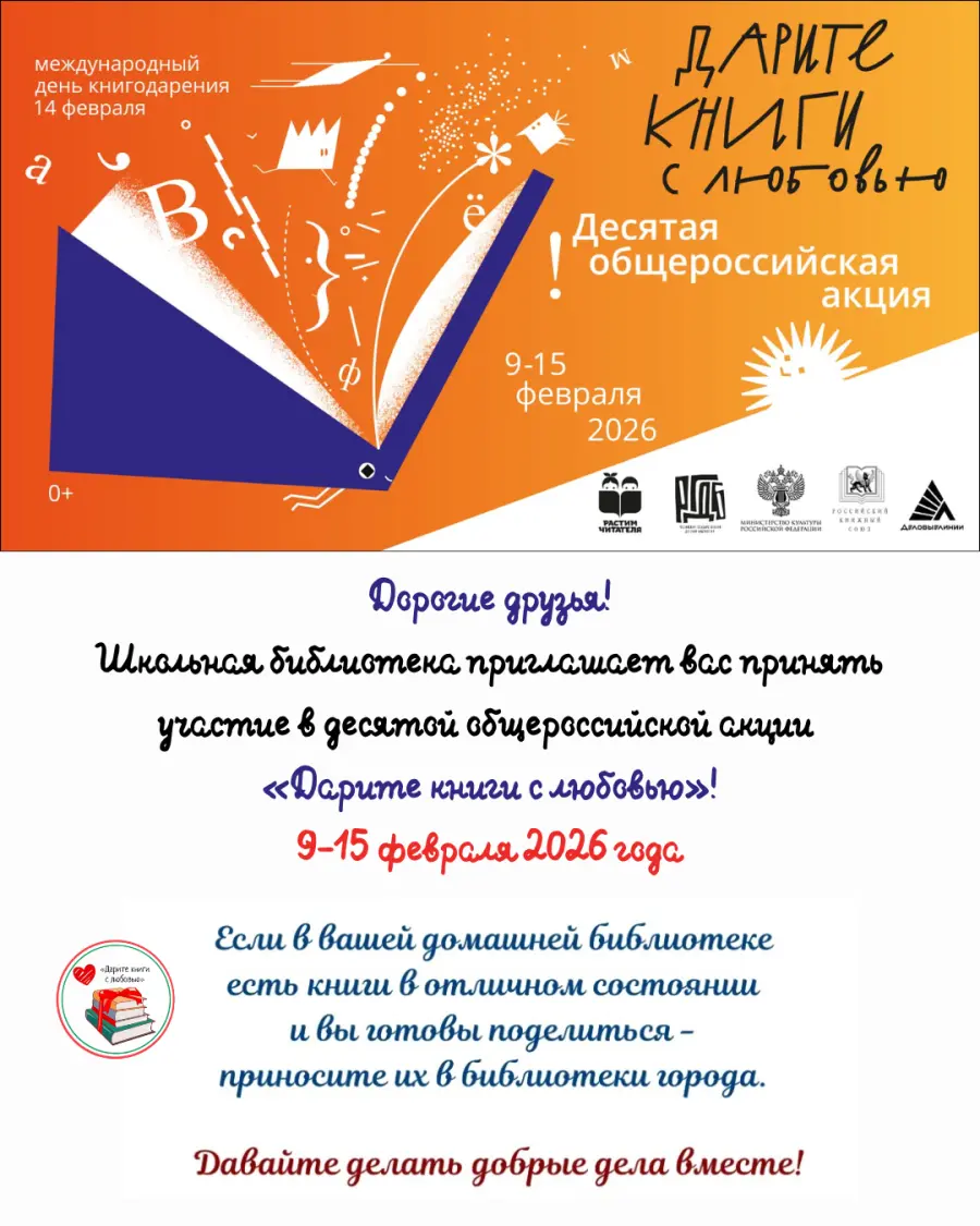 С 9 по 15 февраля 2026 года пройдет десятая общероссийская акция "Дарите книги с любовью", приуроченная к Международному дню книгодарения – 14 февраля.