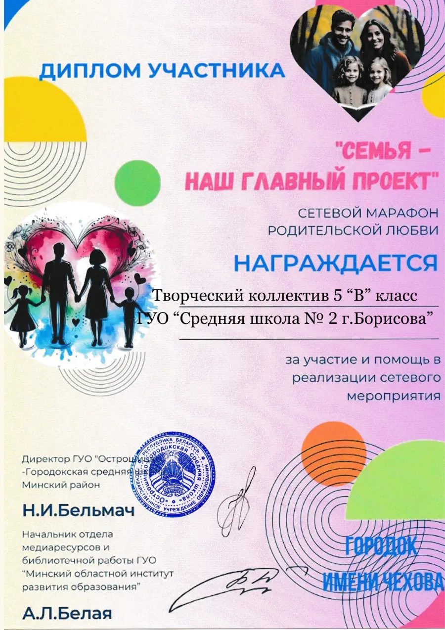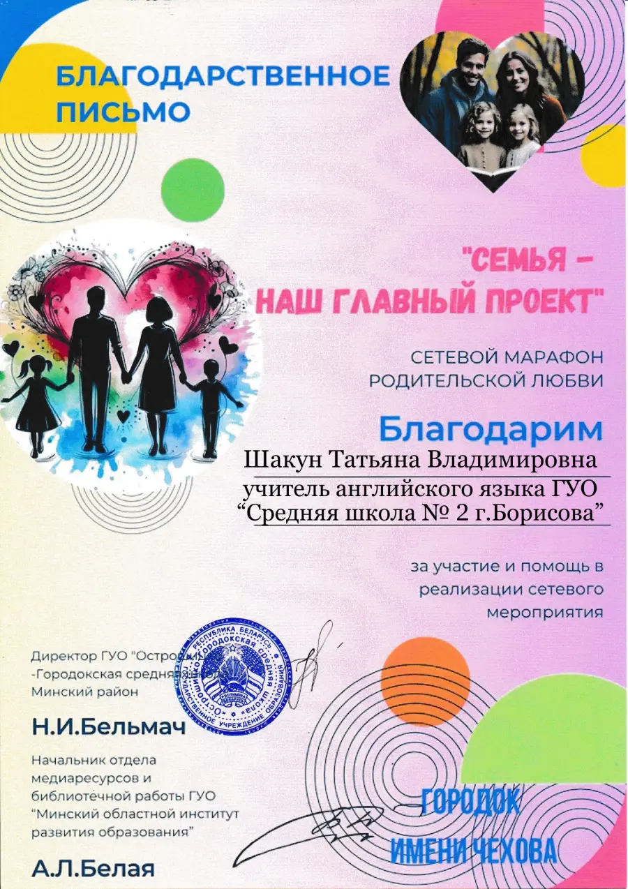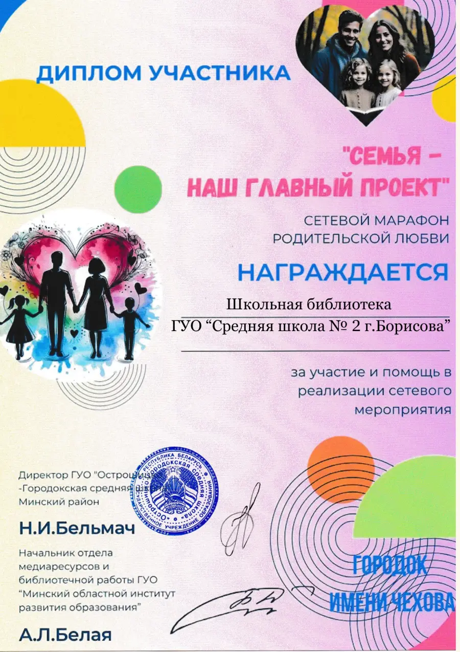 Марафон стал добрым эхом, откликом сердец, посвящённым двум самым светлым праздникам – Дню матери и Дню отца в Республике Беларусь. Этот марафон задумывался не просто как акция, а как приглашение к диалогу поколений, к бережному сохранению того, что дороже всего: любви, доверия, семейного уюта и тёплого взгляда родных глаз. Его цель – напомнить каждому: семья — не просто кров под одной крышей, а живой источник добра, мудрости и силы, передаваемый из поколения в поколение. Организатором выступила библиотека ГУО «Острошицко-Городокская средняя школа» – при поддержке Управления по образованию Минского районного исполнительного комитета и содействии отдела медиаресурсов и библиотечной работы Минского областного института развития образования.