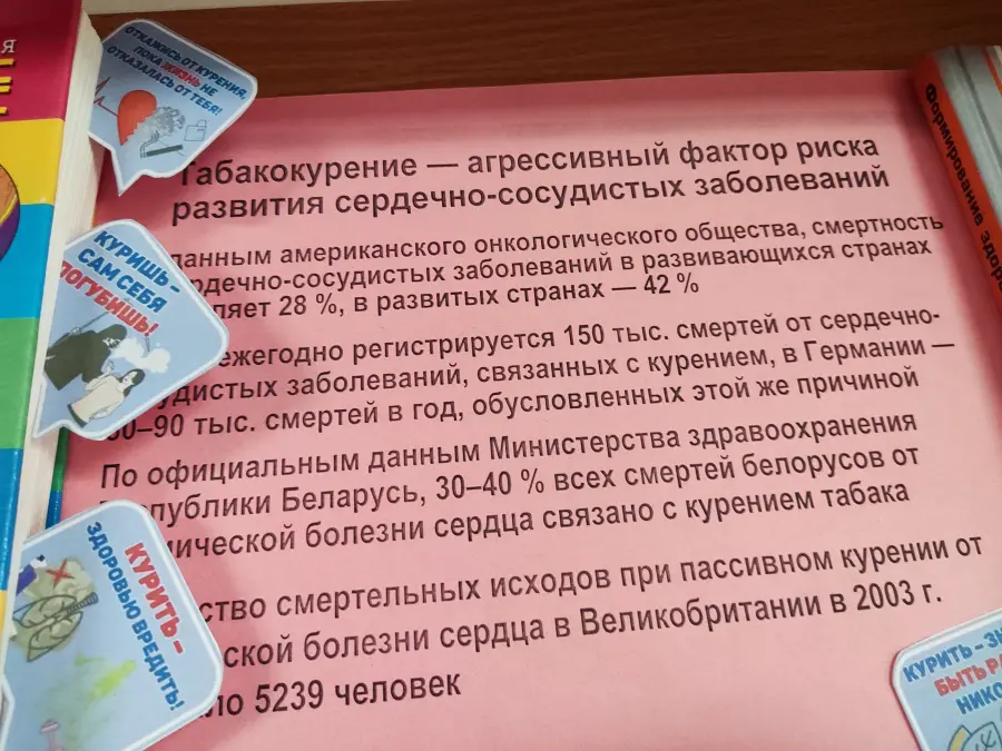 На выставке представлены книги, из которых можно узнать о вреде курения, как никотин влияет на общее состояние организма и на каждый орган в отдельности. Согласно статистике, у нас каждая 10-ая женщина курит, а среди мужчин 50-60% заядлые курильщики. Согласно данным ВОЗ курение является причиной 85% смертельных исходов от рака легких, бронхов, трахеи, 16% смертей от ишемической болезни сердца, 26% смертей от туберкулеза, 24% инфекций нижних дыхательных путей. Суть международного дня отказа от курения заключается в попытке снизить распространенность этой пагубной привычки, повысить осведомленность граждан о вреде курения, в чем помогут книги с выставки.
