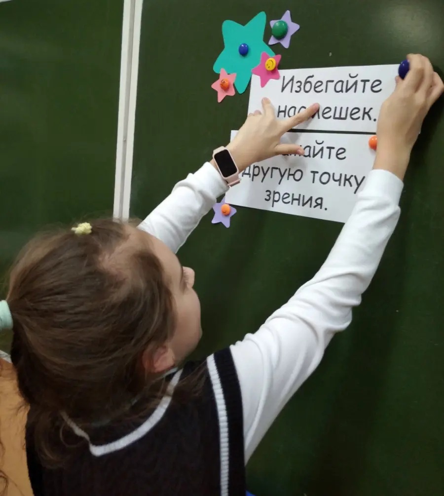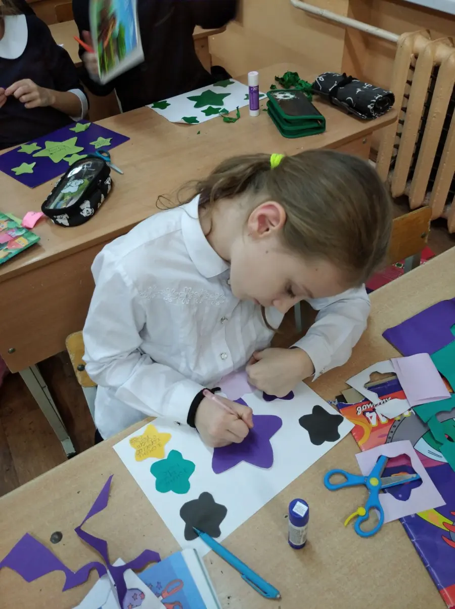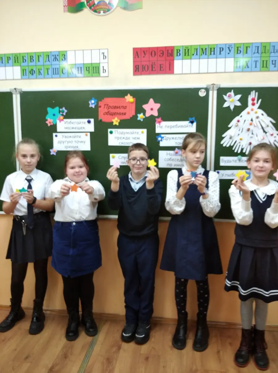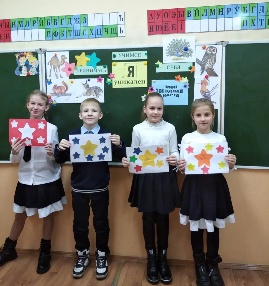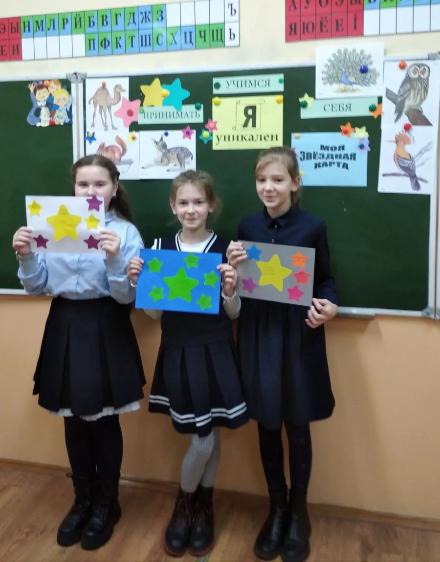 В игровой форме ребята учились познавать себя: " Каков я? Качества, которыми могу гордиться. Чем интересен для окружающих? Чему могу научить и чему хочу научиться сам?". Обсуждали ситуации "Я не такой ... Это хорошо или плохо?", создавали индивидуальные звёздные карты. На следующем занятии упражнялись в соблюдении правил общения. Не всегда легко выражать свои мысли и чувства, слушать и понимать других людей. Зато так весело вместе играть и танцевать, говорить и молчать! А как приятно дарить самим и принимать от одноклассников звёздочки - благодарности! Личная карта пополнилась новым созвездием "Спасибо тебе ..." Решили: будем учиться уважительному общению.