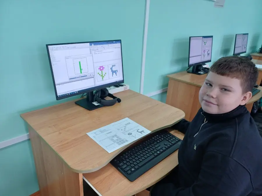 На занятии ребята познакомились с понятием «Робот», со средой обитания и системой команд исполнителя Робот, научились составлять линейные алгоритмы в среде программирования PascalABC.NET, в результате выполнения которых Робот перемещался по клетчатому полю и закрашивал клетки, создавая различные узоры и рисунки.