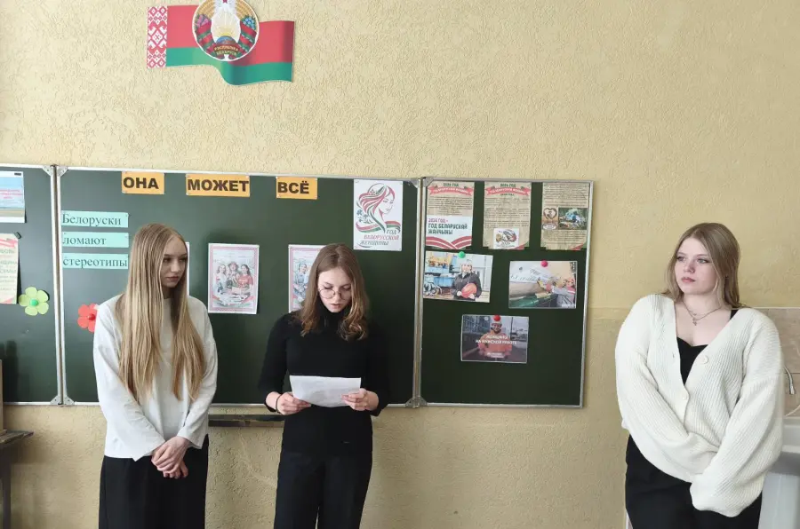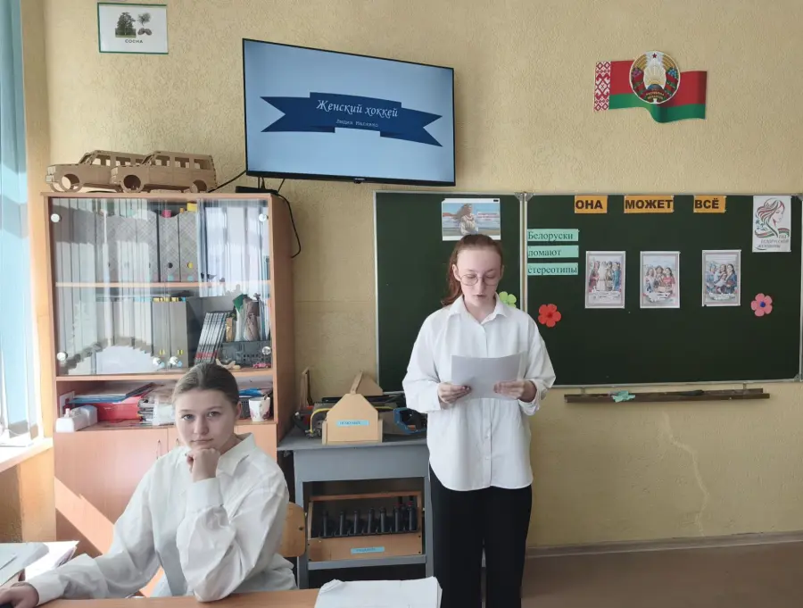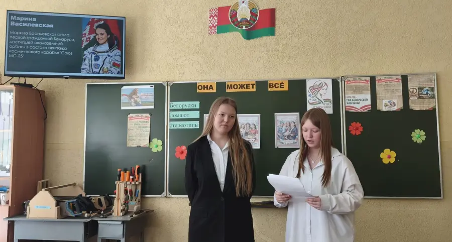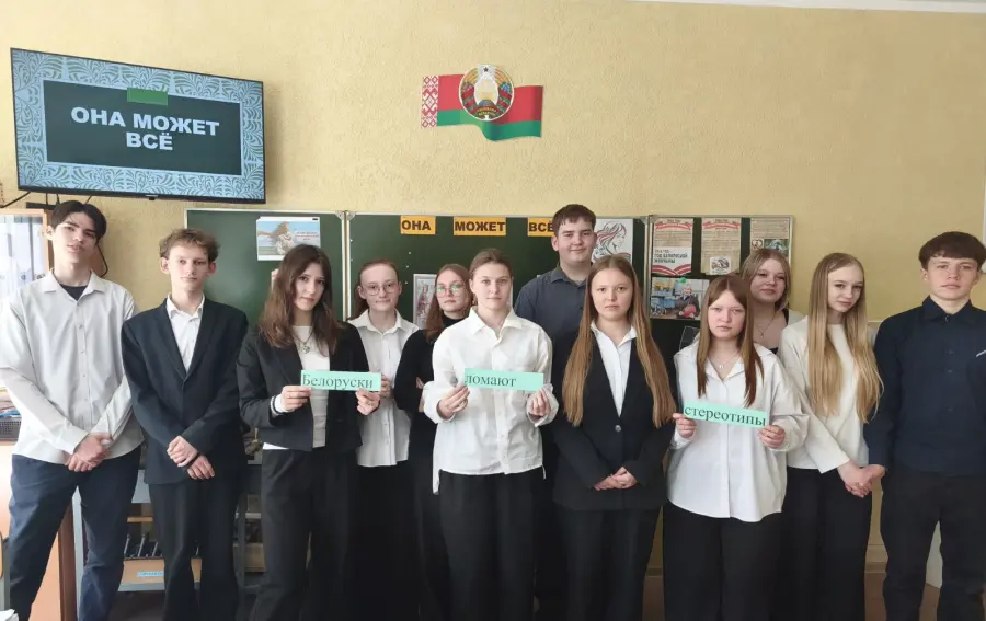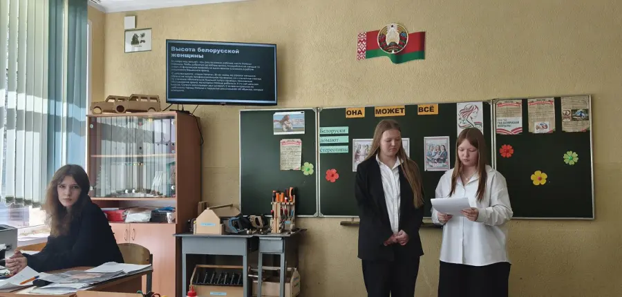 В рамках празднования Года белорусской женщины, объявленного в стране, учащиеся 9 "Б" класса приняли участие во внеклассном мероприятии под названием "Она может всё" (разрушаем стереотипы о "мужских" и " женских" профессиях).