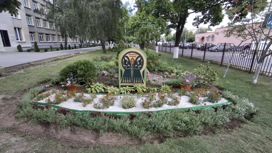 На заднем плане цветочного модуля в обрамлении бордюра из хосты многолетней и петунии гибридной расположена малая архитектурная форма, посвященная 80-летию Великой Победы «Беларусь помнит», символизирующая скорбь белорусского народа по жертвам геноцида.